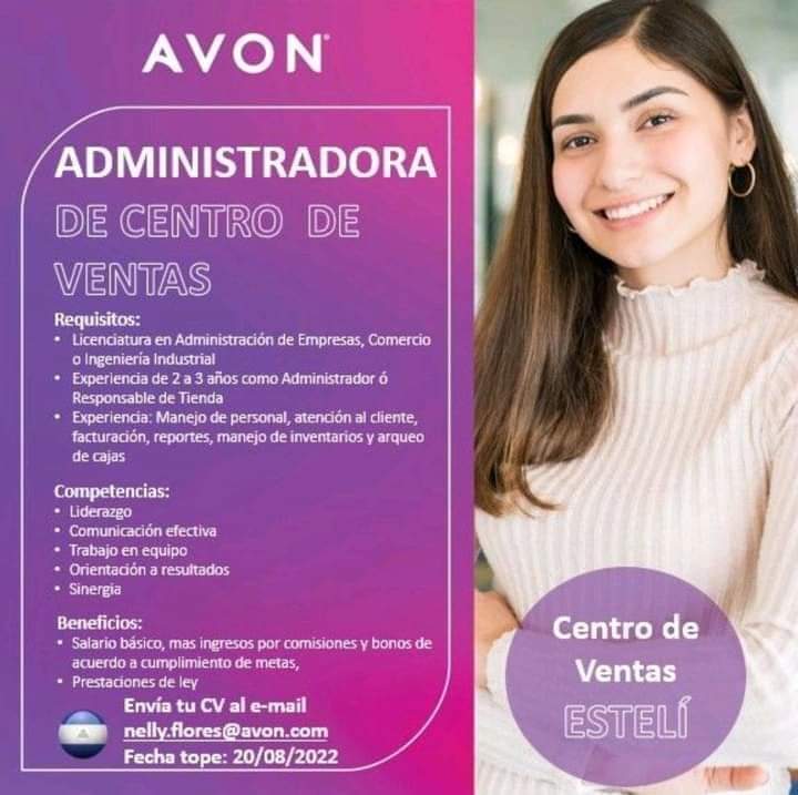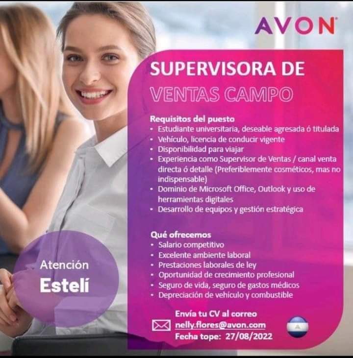 La fecha límite para enviar CV es el 27 de agosto de 2022. AVON ofrece seguro de vida, de gastos médicos y depreciación y combustible del vehículo.