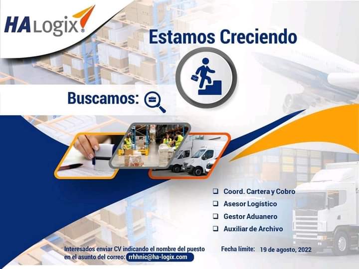 Las vacantes son para coordinador de cartera y cobro, asesor logístico, gestor aduanero y auxiliar de archivo. Informar en el asunto de su correo el puesto para el que desea aplicar. La fecha límite para enviar CV es el 19 de agosto de 2022.